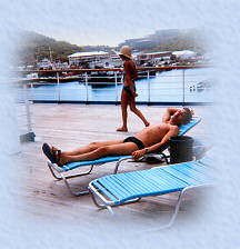 When we got back on board the ship in St. Thomas there was lots of time to relax. My wife caught me napping in the sun with Sheri walking by. This was just before the young 20 to 30 year old group of party loving souls came back from the rum beach party they had been on.