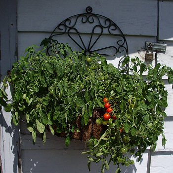 The tumbler tomatoes in the hanging basket on the shed